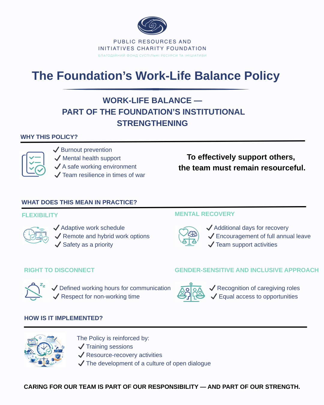 Public Resources and Initiatives Charity Foundation announces the introduction of the Work-Life Balance Policy — an internal document developed within the framework of the organization’s institutional strengthening strategy as part of the project “Strengthening the Institutional Capacity of the Public Resources and Initiatives Charity Foundation,” implemented by the Public Resources and Initiatives Charity Foundation with technical support of UN Women Ukraine and financial support from the Women’s Peace and Humanitarian Fund (WPHF). The Policy is already being applied in the team’s daily work and formalizes the Foundation’s approach to building a safe, ethical, and non-discriminatory working environment.