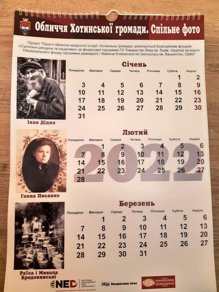 В рамках проекту був підготовлений промоційний календар який відкриє можливості для більш ґрунтовного знайомства з конкретними людьми, які творили й продовжують творити спільний дім – Хотинську громаду. Для календаря було відібрано 12 фотографій за критеріями як художньої виразності знімків, так і актуальності історій цих людей у сучасному контексті, наприклад фото жителя громади, офіцера, учасника українсько-російської війни. Календар видано накладом 300 екземплярів. Його розповсюдження розпочато на виставці у Хотині.