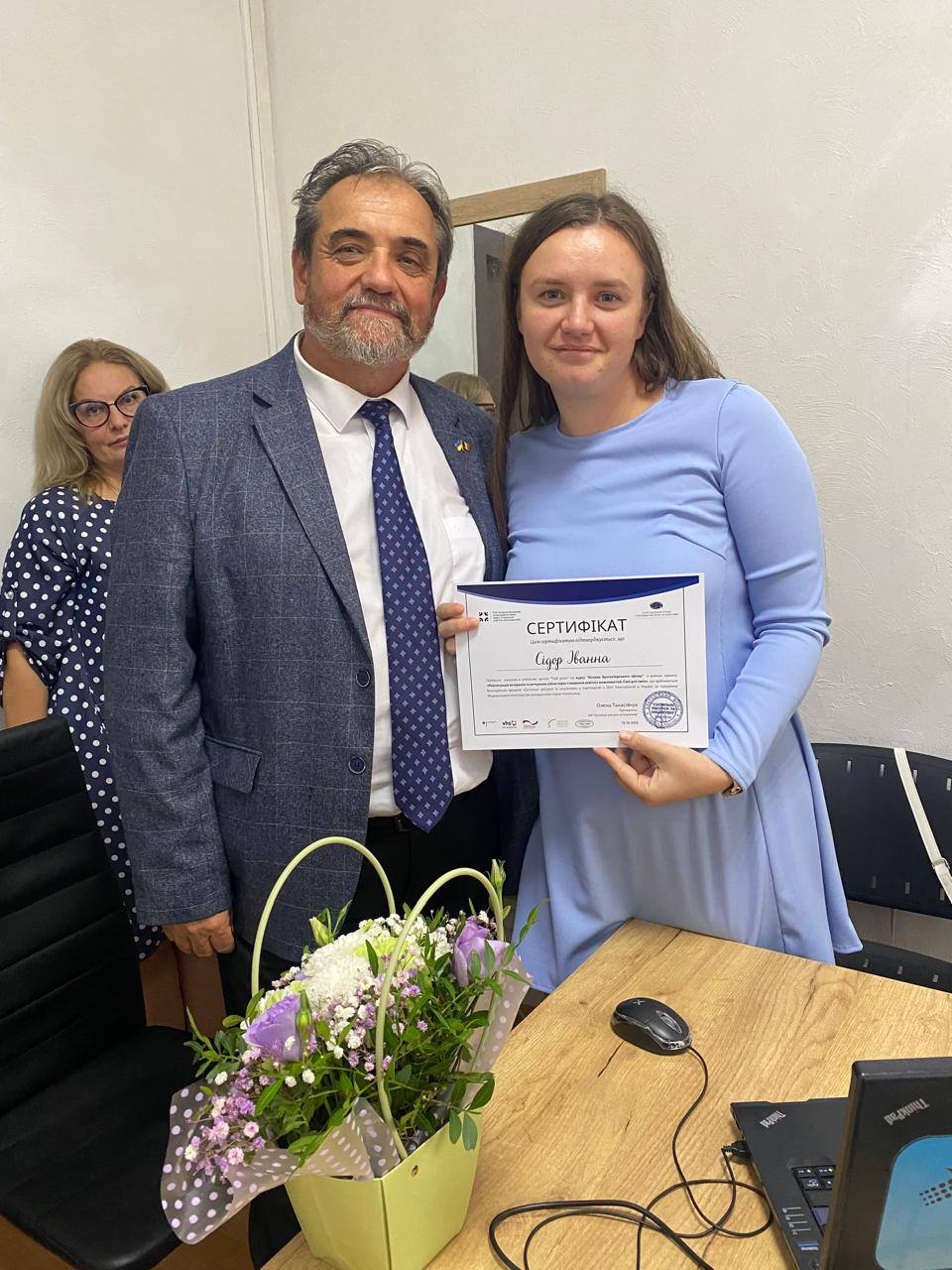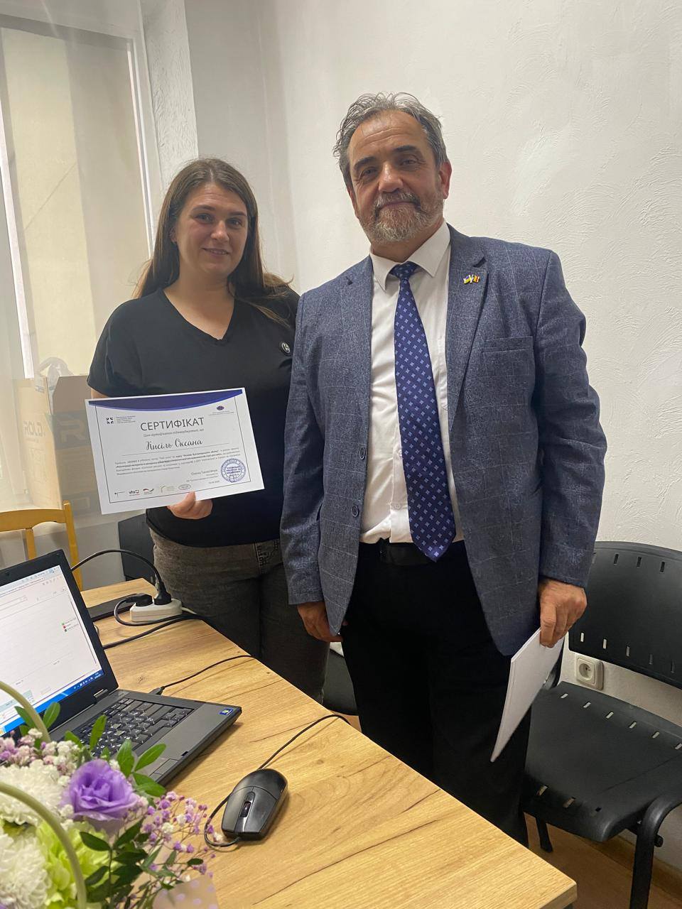 Сьогодні віце-президент Фонду Сергій Гакман та керівниця відділу проєктів Наталія Філяк вручили останні сертифікати учасникам курсу «Основи бухгалтерії».