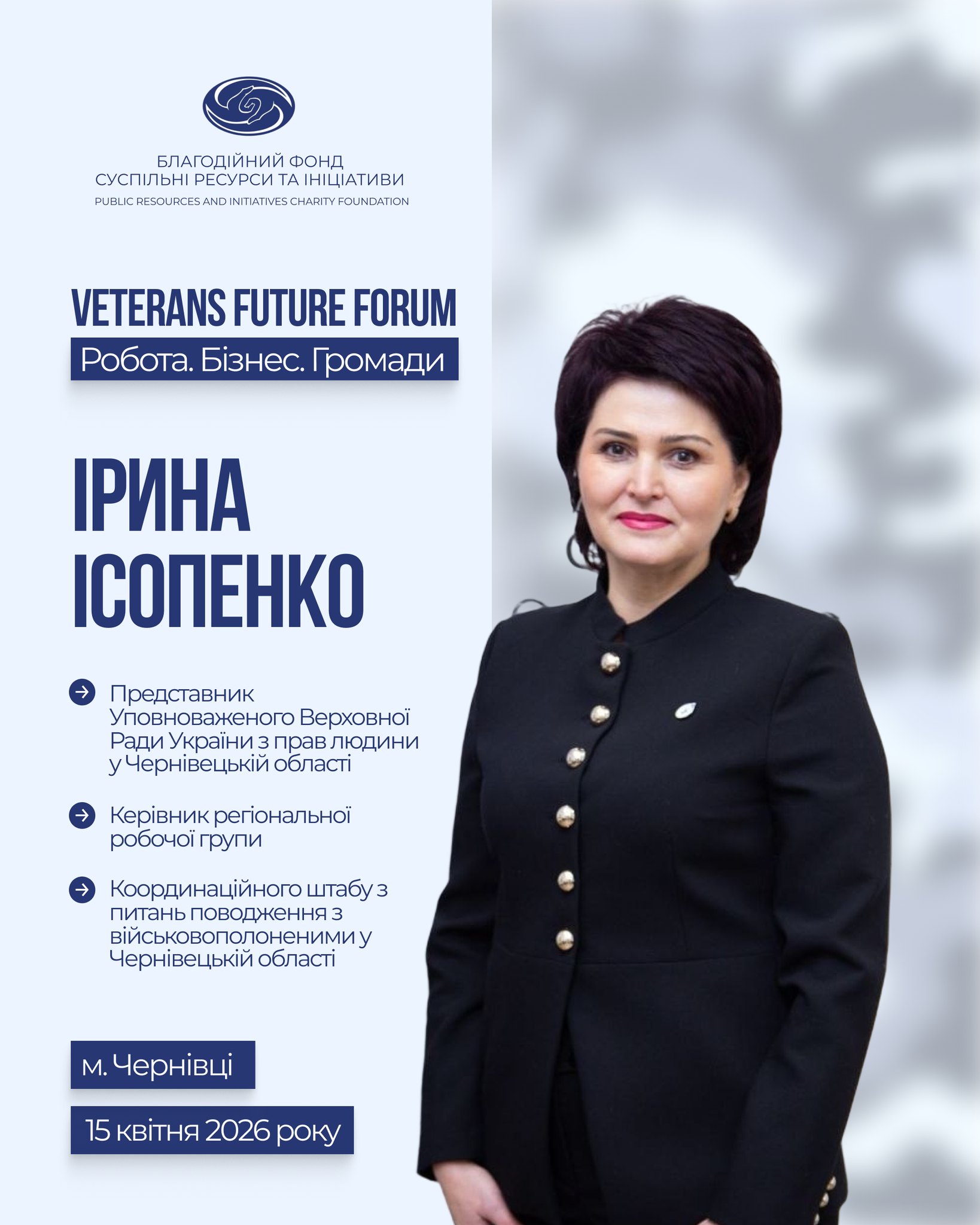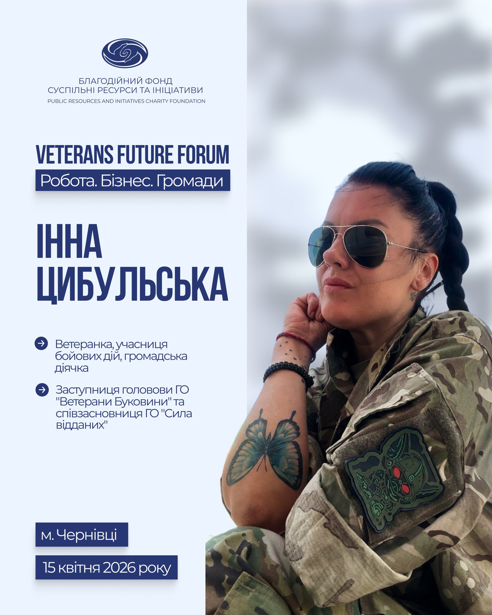 Модераторка Спеціального блоку "10 уроків бізнесу з фронту: лідерство, команда і рішення у кризових умовах" - Inna Tsibulskaya, ветеранка, учасниця бойових дій, громадська діячка, заступниця головови ГО "Ветерани Буковини" та співзасновниця ГО "Сила відданих"