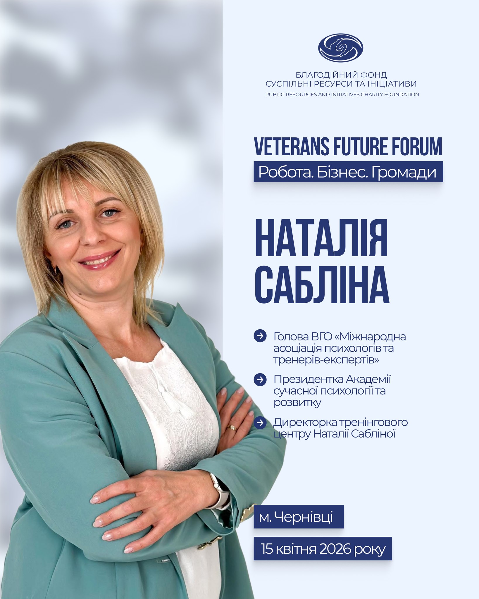 Наталія Сабліна, кандидатка психологічних наук, доцент, голова Міжнародної асоціації психологів та тренерів-експертів, Президентка Академії сучасної психології та розвитку, засновниця Школи лідерства ветеранів (Київ)