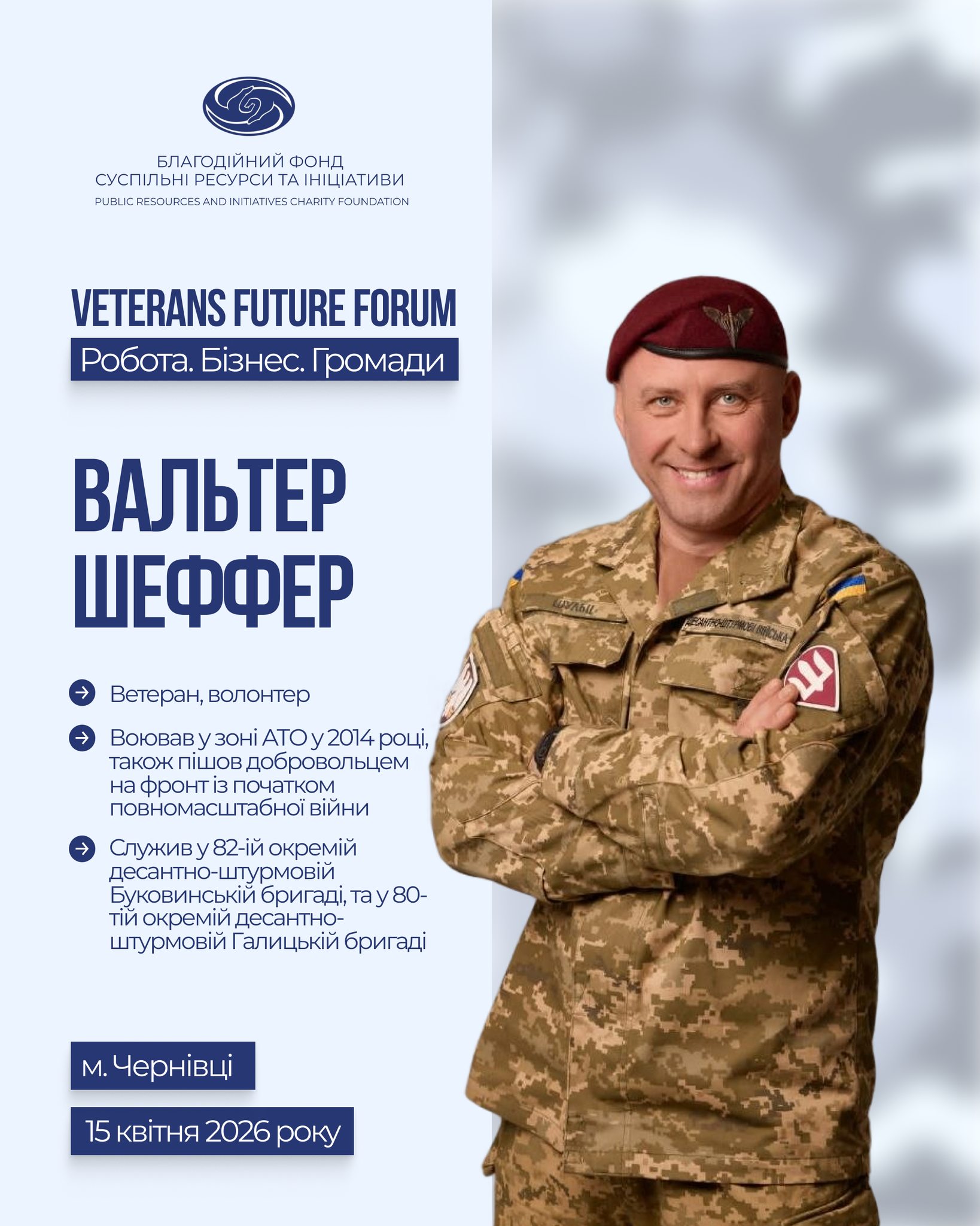 Модератор панельної дискусіі "Інвестиції у ветеранський потенціал: бізнес, фінанси, можливості" - Вальтер Шеффер, ветеран російсько-української війни