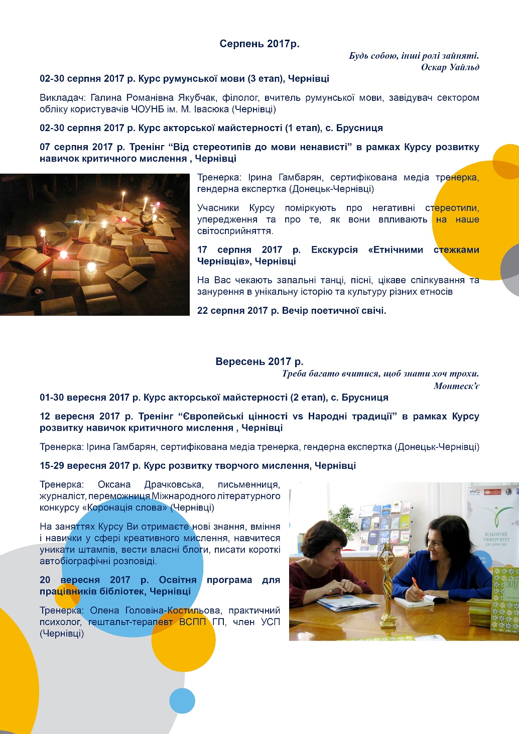 01.06.2017 р. – Стартував новий проект Благодійного фонду «Суспільні ресурси та ініціативи» "Вдосконалюємось навчаючись" у партнерстві з Чернівецькою обласною універсальною науковою бібліотекою ім. М. Івасюка за підтримки Міністерства закордонних справ Німеччини. У 2017 році Програма неформальної освіти впроваджується в рамках проекту DVV International та ІДЦ «Інтеграція та розвиток» «Громада, що навчається: трансформація конфліктів в Україні та Молдові через активну громадську участь».